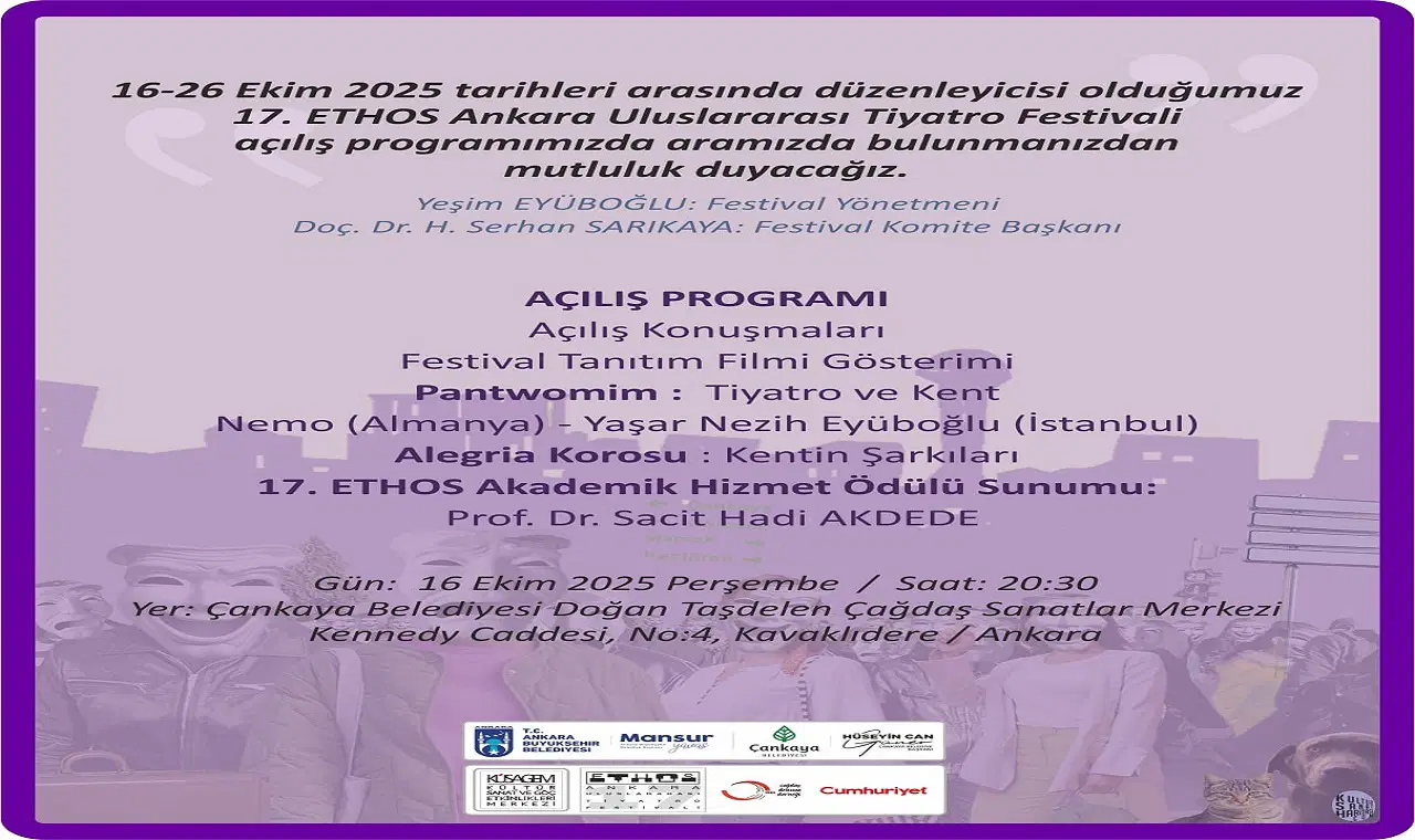 Bu yıl 17.'si düzenlenecek olan ETHOS Ankara Uluslararası Tiyatro Festivali, 16-26 Ekim 2025 tarihleri arasında sanatseverlerle buluşuyor.